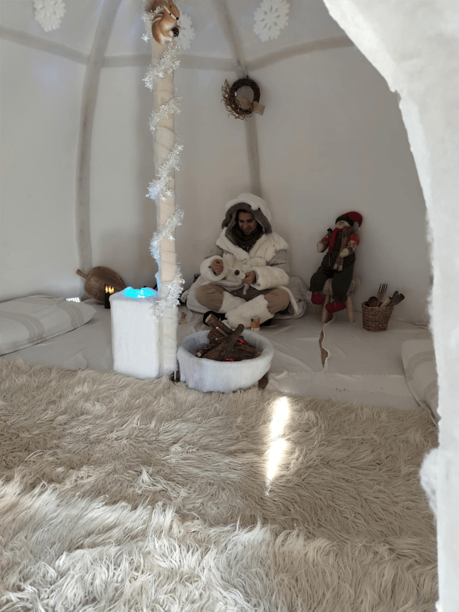 Καλώς ήρθες στο πρώτο ιγκλού της Ελλάδας που δημιούργησε η Fireflies Fest, όπου ο πάγος συναντά τη φωτιά της φαντασίας. Μέσα σε αυτό το μαγικό καταφύγιο σε περιμένει ο Χοβίκ, ο ηθοποιός-Εσκιμώος, που ζωντανεύει ιστορίες του Αρκτικού Κύκλου: μύθους για τα φωτεινά βόρεια φώτα, θρύλους για πολικές αρκούδες και αδάμαστα πνεύματα του πάγου, αφηγήσεις που μεταφέρουν τη σοφία και τα μυστικά των ανθρώπων και της φύσης εκεί ψηλά στον Βορρά.