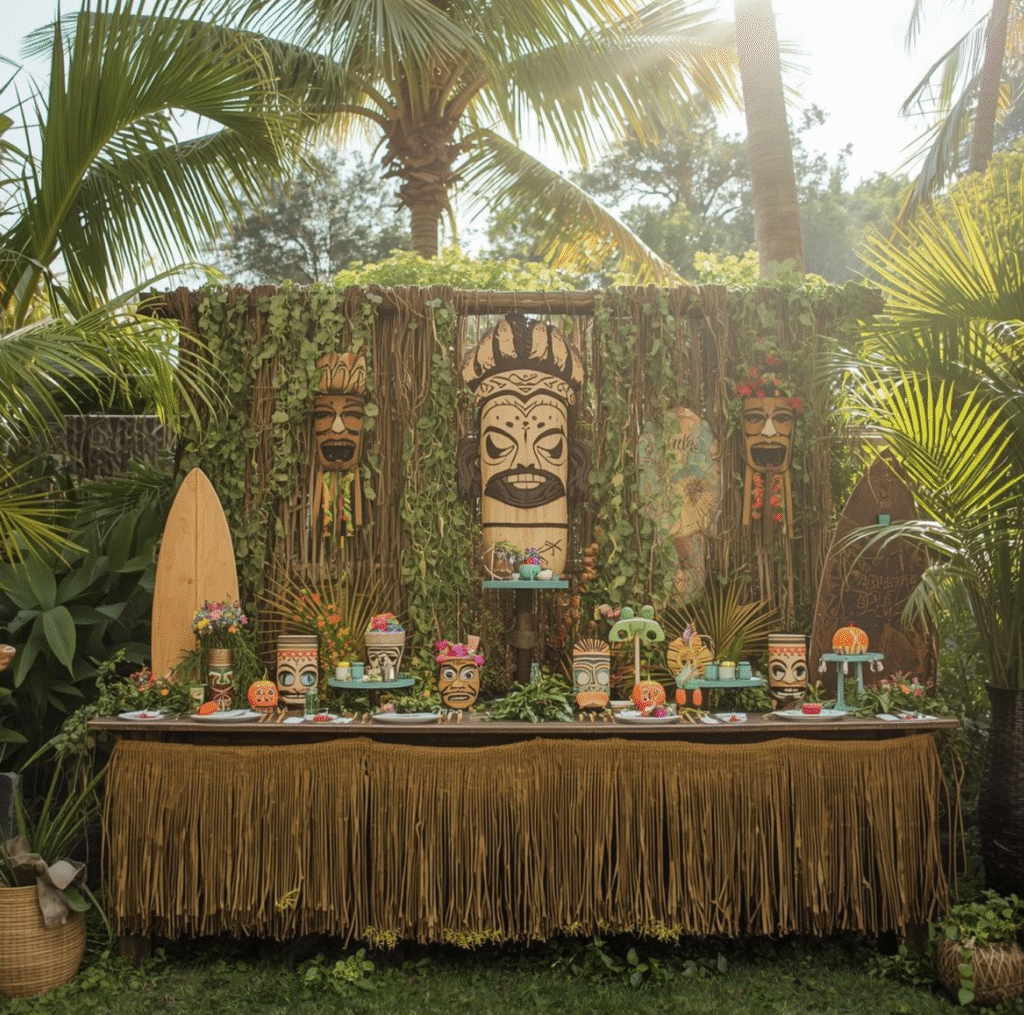 Τραπέζι υποδοχής με tropical & ocean-themed αξεσουάρ, κοχύλια, lei και Māori μοτίβα